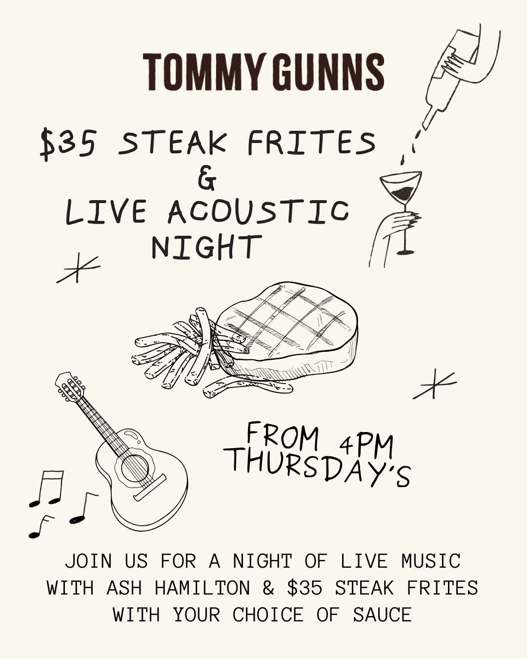 Enjoy our $35 Steak Frites special while soaking up the atmosphere of our Live Acoustic Night featuring Ash Hamilton performing from 5pm.